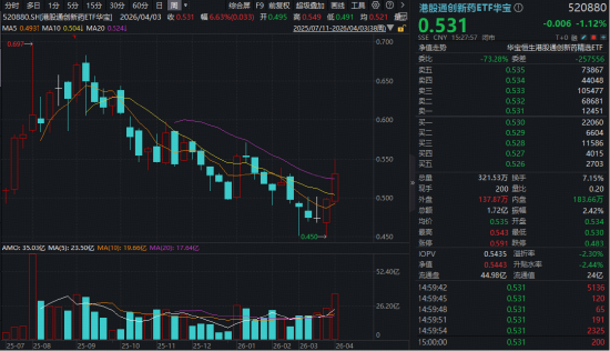 港股因耶稣遇难节假期休市,港股通鼎新药ETF华宝(520880)、港股通医疗ETF华宝(159137)在A股的往复价钱足够由资金博弈决定,本日同跌1%傍边。