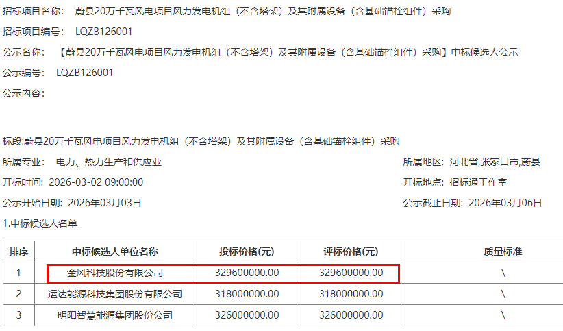 东方风力发电网讯:3月3日,东莞配资网站电子招标收集平台发布《【蔚县20万千瓦风电名堂风力发电机组(不含塔架)偏激附庸设备(含基础锚栓组件)采购】中标候选东谈主公示》,公告清晰该名堂容量200MW,金风科技预中标!