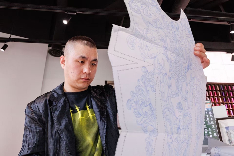 蔓楼兰首席联想师王福泰正修改最新图样。 文申报记者 周俊超摄