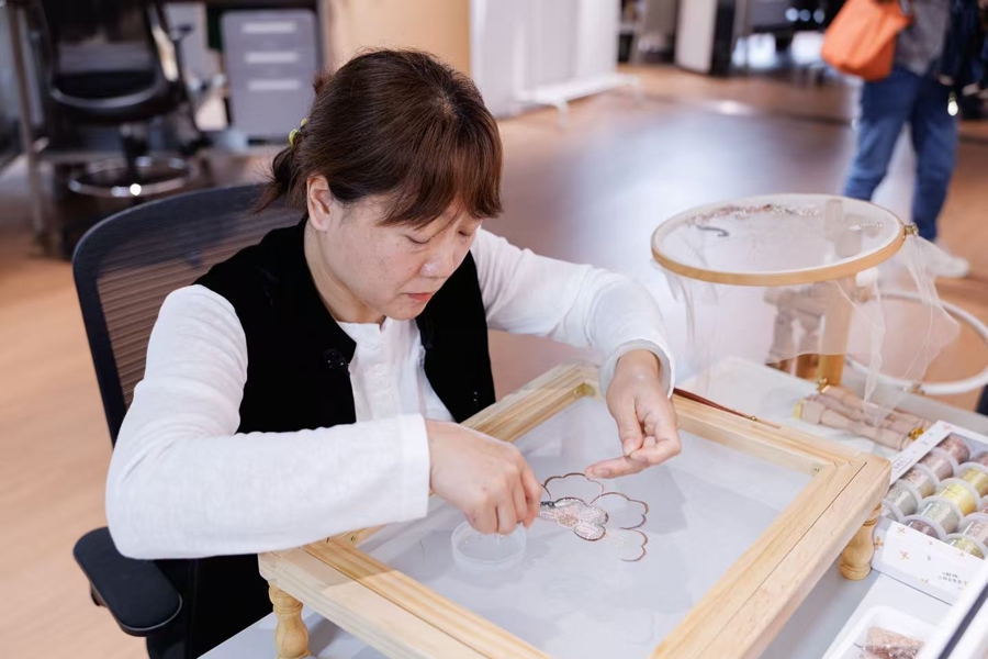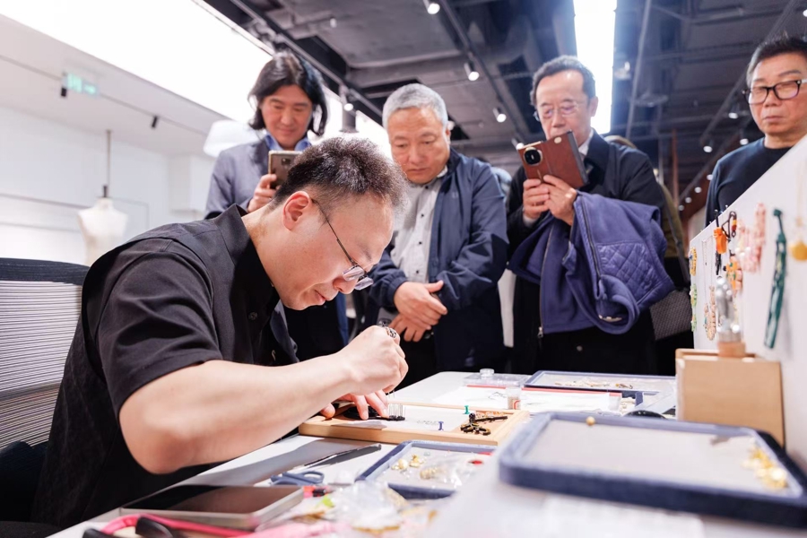 业内东谈主士不雅摩盘扣制作现场。 文申报记者 周俊超摄