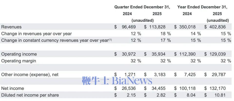 2月5日,谷歌母公司Alphabet发布截止2025年12月31日的第四季度财报自满,当季实现营收1138.28亿好意思元,同比增长18%,超出华尔街渊博预期的1114亿好意思元;稀释后每股收益为2.82好意思元,不异超过阛阓预期的2.63好意思元。同期净利润达到344.55亿好意思元,同比增长接近30%。