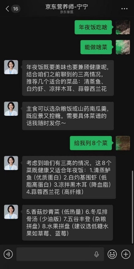 河北的张女士往年总为年夜饭发愁:老东说念主有“三高”问题,孩子挑食,我方又怕吃胖。本年春节前,她提前干系了京东养分师,定制了一桌低糖、高纤、少油的团圆菜单,让老东说念主的血糖不错稳稳的,孩子也能吃得怡悦。