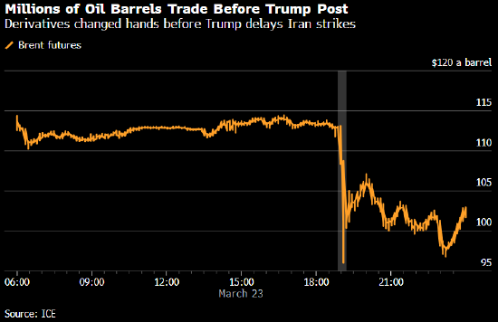 字据交游所数据,从华盛顿时辰周一早上6点49分初始,短短两分钟内,特别于至少600万桶布伦特和WTI原油的期货合约被卖出。而之前五个交游日同时的平均成交量约为700手,合70万桶。 特朗普大约是在早上7点05分在Truth Social上发帖的。