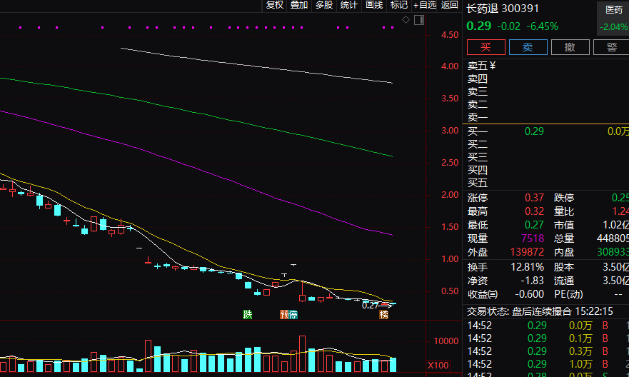 长药退今天股价大跌6.45%,盘中最低至0.27元/股,创出该股历史新低。对于公司股票被停止上市的原因,公告涌现,是凭证《行政经管决定书》载明的事实,公司2021年至2023年年度文告信息败露存在诞妄记录。