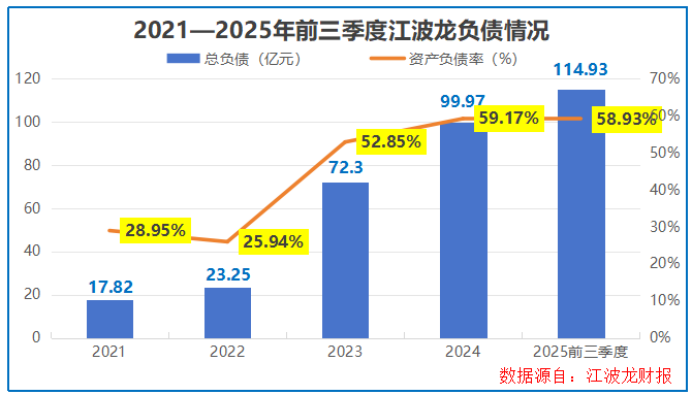 直观的体现,便是江波龙持续走高的负债规模,截至2025年三季度末已达115亿元,对应资产负债率升至58.93%。